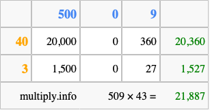 That's all there is to it! As you can see from the box above, the answer to 509 times 43 using the box method is 21,887.