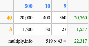 Below is an illustration showing you how to calculate 519 times 43 using the box method, using the instructions above.