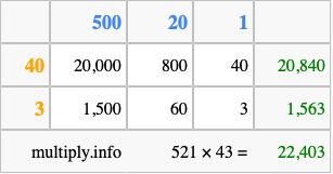That's all there is to it! As you can see from the box above, the answer to 521 times 43 using the box method is 22,403.