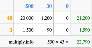 That's all there is to it! As you can see from the box above, the answer to 530 times 43 using the box method is 22,790.