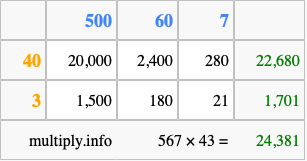 Below is an illustration showing you how to calculate 567 times 43 using the box method, using the instructions above.
