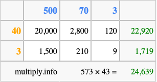 That's all there is to it! As you can see from the box above, the answer to 573 times 43 using the box method is 24,639.