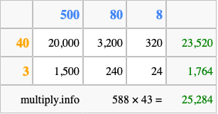 That's all there is to it! As you can see from the box above, the answer to 588 times 43 using the box method is 25,284.