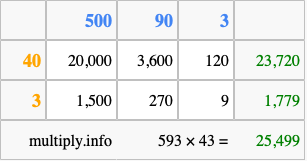 That's all there is to it! As you can see from the box above, the answer to 593 times 43 using the box method is 25,499.