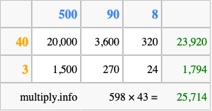 That's all there is to it! As you can see from the box above, the answer to 598 times 43 using the box method is 25,714.