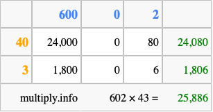 That's all there is to it! As you can see from the box above, the answer to 602 times 43 using the box method is 25,886.