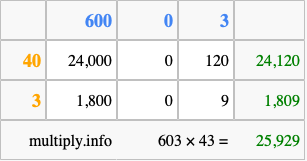 That's all there is to it! As you can see from the box above, the answer to 603 times 43 using the box method is 25,929.