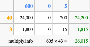 That's all there is to it! As you can see from the box above, the answer to 605 times 43 using the box method is 26,015.