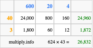 That's all there is to it! As you can see from the box above, the answer to 624 times 43 using the box method is 26,832.