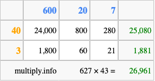 Below is an illustration showing you how to calculate 627 times 43 using the box method, using the instructions above.