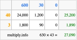 Below is an illustration showing you how to calculate 630 times 43 using the box method, using the instructions above.