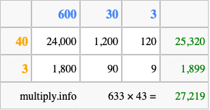 Below is an illustration showing you how to calculate 633 times 43 using the box method, using the instructions above.