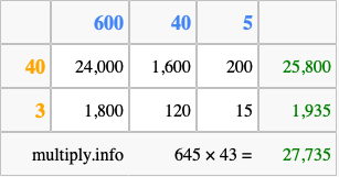 Below is an illustration showing you how to calculate 645 times 43 using the box method, using the instructions above.