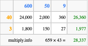 Below is an illustration showing you how to calculate 659 times 43 using the box method, using the instructions above.