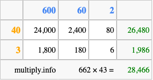 That's all there is to it! As you can see from the box above, the answer to 662 times 43 using the box method is 28,466.