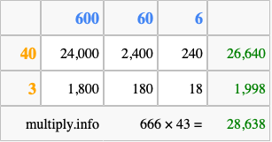 That's all there is to it! As you can see from the box above, the answer to 666 times 43 using the box method is 28,638.