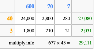 That's all there is to it! As you can see from the box above, the answer to 677 times 43 using the box method is 29,111.