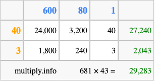 Finally, we add up all the sums we found in step 3 to get our final answer to 681 times 43.