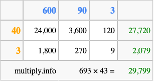 Finally, we add up all the sums we found in step 3 to get our final answer to 693 times 43.