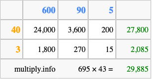 Finally, we add up all the sums we found in step 3 to get our final answer to 695 times 43.