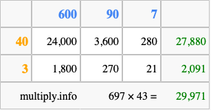 That's all there is to it! As you can see from the box above, the answer to 697 times 43 using the box method is 29,971.