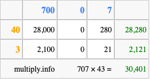 Finally, we add up all the sums we found in step 3 to get our final answer to 707 times 43.