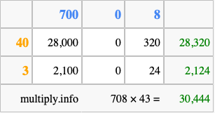 Below is an illustration showing you how to calculate 708 times 43 using the box method, using the instructions above.