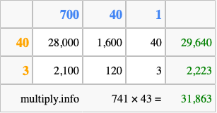 Finally, we add up all the sums we found in step 3 to get our final answer to 741 times 43.