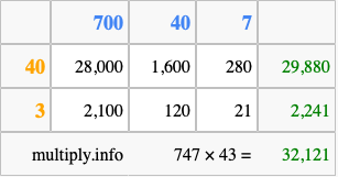 Finally, we add up all the sums we found in step 3 to get our final answer to 747 times 43.