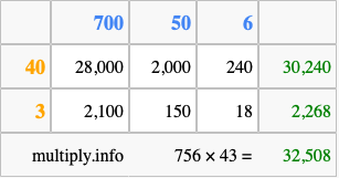 Finally, we add up all the sums we found in step 3 to get our final answer to 756 times 43.