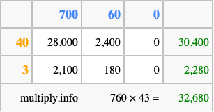 Below is an illustration showing you how to calculate 760 times 43 using the box method, using the instructions above.