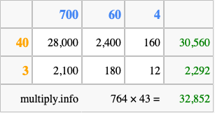 Below is an illustration showing you how to calculate 764 times 43 using the box method, using the instructions above.
