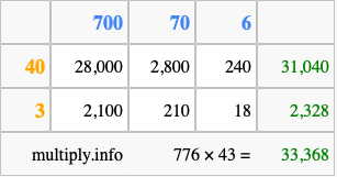 That's all there is to it! As you can see from the box above, the answer to 776 times 43 using the box method is 33,368.