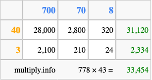 That's all there is to it! As you can see from the box above, the answer to 778 times 43 using the box method is 33,454.