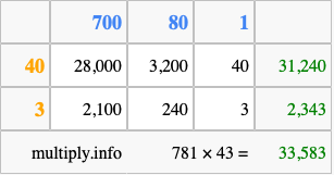 That's all there is to it! As you can see from the box above, the answer to 781 times 43 using the box method is 33,583.