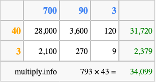 Below is an illustration showing you how to calculate 793 times 43 using the box method, using the instructions above.