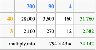 That's all there is to it! As you can see from the box above, the answer to 794 times 43 using the box method is 34,142.