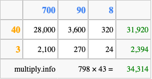 That's all there is to it! As you can see from the box above, the answer to 798 times 43 using the box method is 34,314.