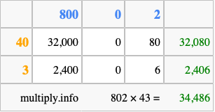That's all there is to it! As you can see from the box above, the answer to 802 times 43 using the box method is 34,486.