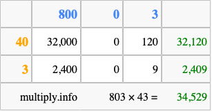 That's all there is to it! As you can see from the box above, the answer to 803 times 43 using the box method is 34,529.