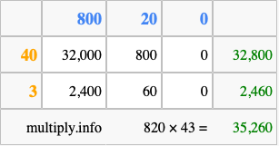Finally, we add up all the sums we found in step 3 to get our final answer to 820 times 43.