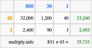 That's all there is to it! As you can see from the box above, the answer to 831 times 43 using the box method is 35,733.