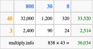 Finally, we add up all the sums we found in step 3 to get our final answer to 838 times 43.