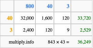 Finally, we add up all the sums we found in step 3 to get our final answer to 843 times 43.