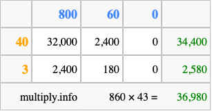 Finally, we add up all the sums we found in step 3 to get our final answer to 860 times 43.