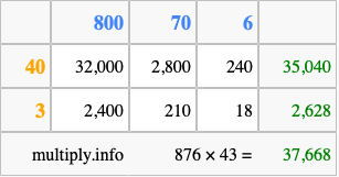 Below is an illustration showing you how to calculate 876 times 43 using the box method, using the instructions above.