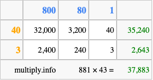 Finally, we add up all the sums we found in step 3 to get our final answer to 881 times 43.