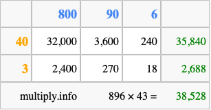That's all there is to it! As you can see from the box above, the answer to 896 times 43 using the box method is 38,528.