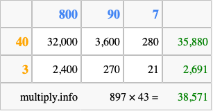 That's all there is to it! As you can see from the box above, the answer to 897 times 43 using the box method is 38,571.
