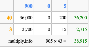 Finally, we add up all the sums we found in step 3 to get our final answer to 905 times 43.